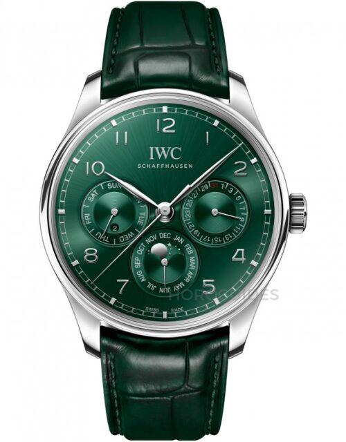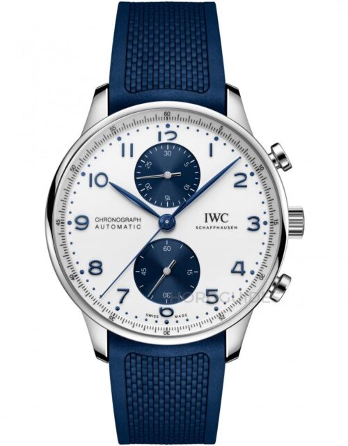 Highlights: The Portugieser Chronograph (IW371620) is a fresh and contemporary take on the established design, featuring a 41mm stainless steel case, a white dial with contrasting blue subdials, blue Arabic numerals, and blued feuille hands. The chronograph minutes counter is placed at 12 o’clock, while the small seconds can be found at 6 o’clock. The sapphire glass case back provides a view of the IWC-manufactured 69355 caliber. The chronograph movement in classic column wheel design enables the measurement of stop times of up to 30-minutes.