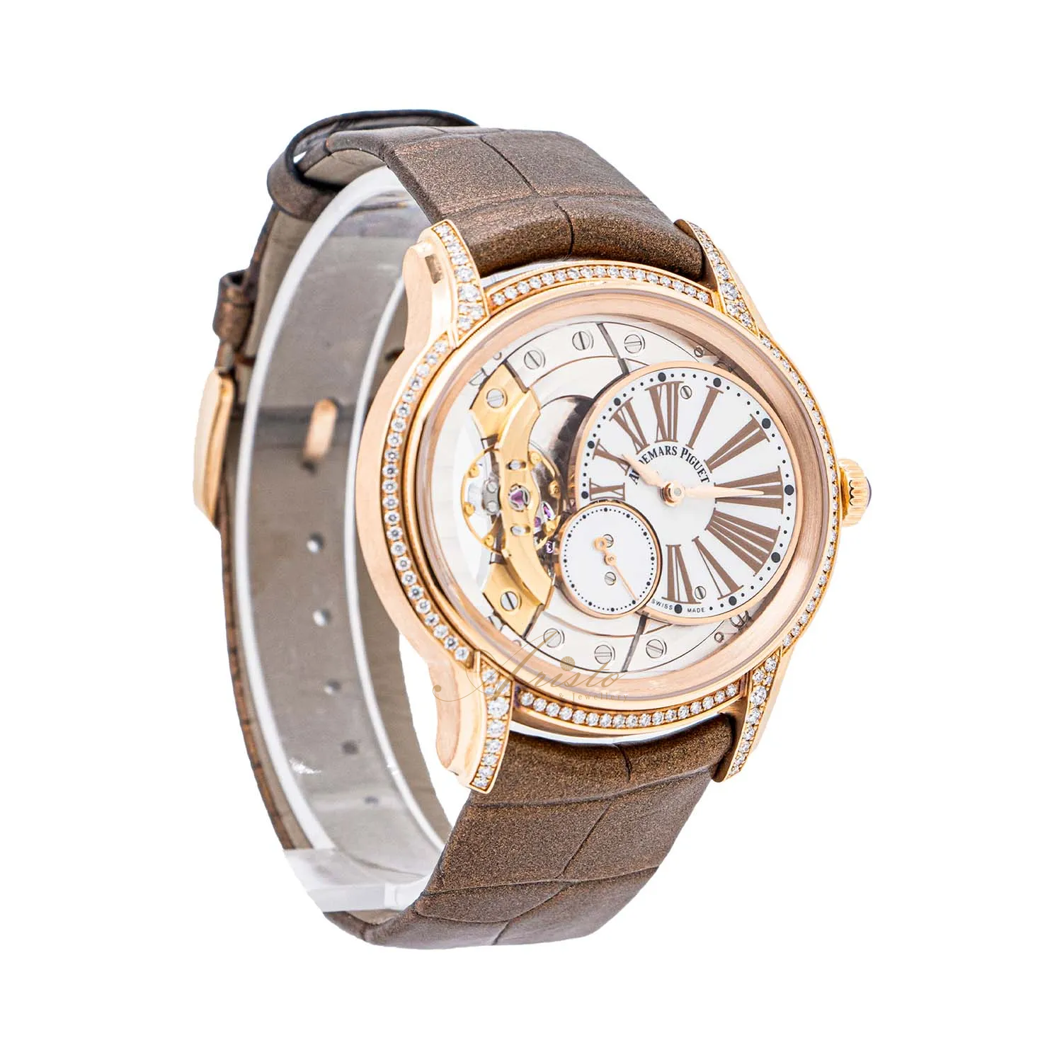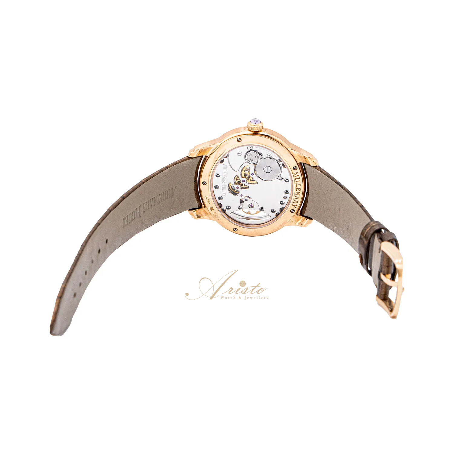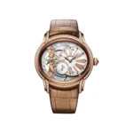 The Audemars Piguet Millenary, reference number 77247OR.ZZ.A812CR.01, launched in 2017, features a rose gold case and a 40mm diameter. This watch is powered by Audemars Piguet’s in-house AP 5201 manual-winding movement. The white dial boasts a clean and simple design suitable for various occasions. This collection is renowned for its distinctive oval design, showcasing the brand’s craftsmanship and technical expertise.