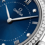This 30mm stainless steel model features a diamond-embellished bezel, a sun-brushed PVD blue dial, rhodium-plated hands, and alternating Roman numerals and diamond indexes, creating a pleasing combination.