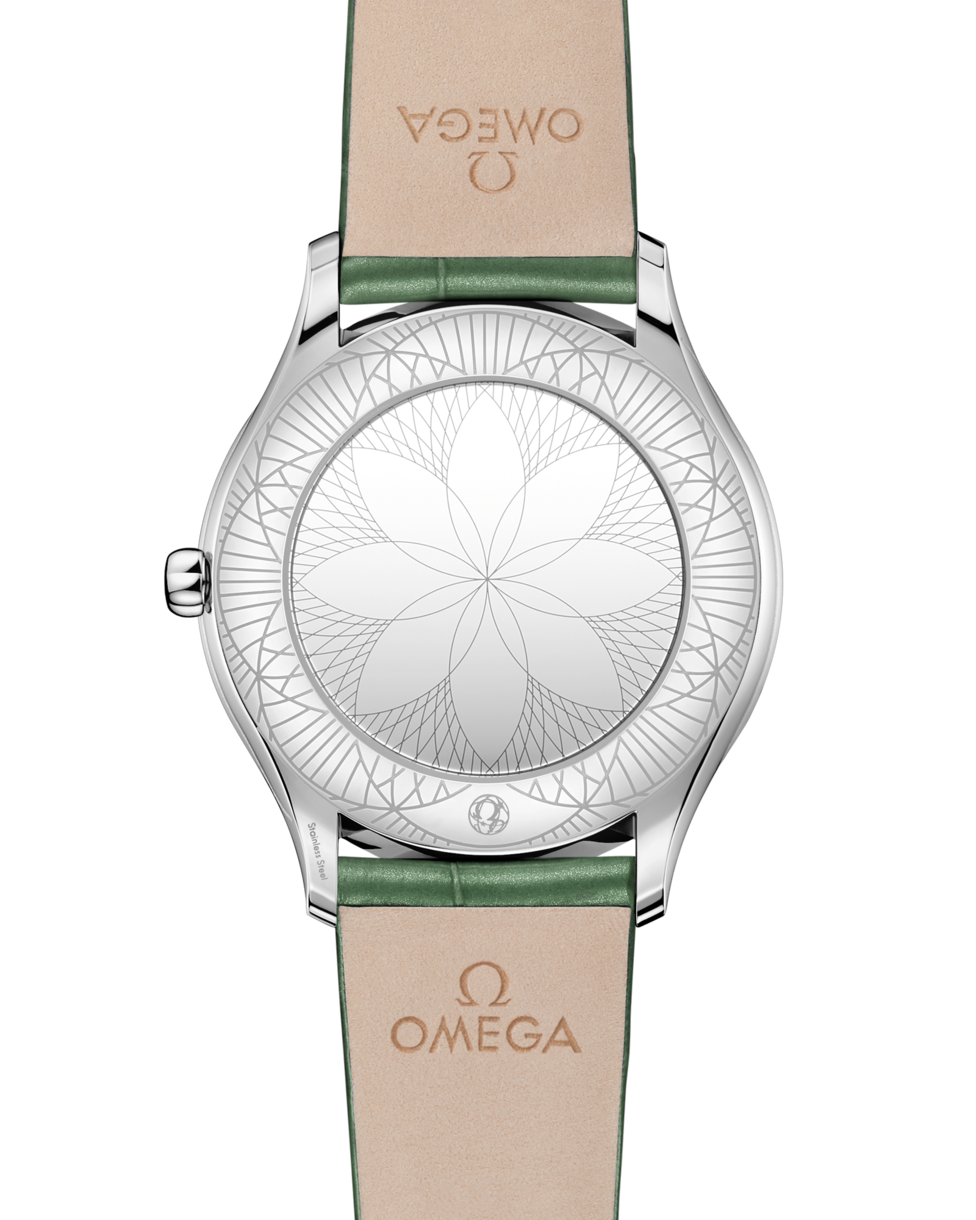 The watch is equipped with the OMEGA calibre 4061 and is presented on a bright green leather strap with a stainless steel buckle. The polished mirror on the back of the watch is metallized and decorated with the Her Time pattern.