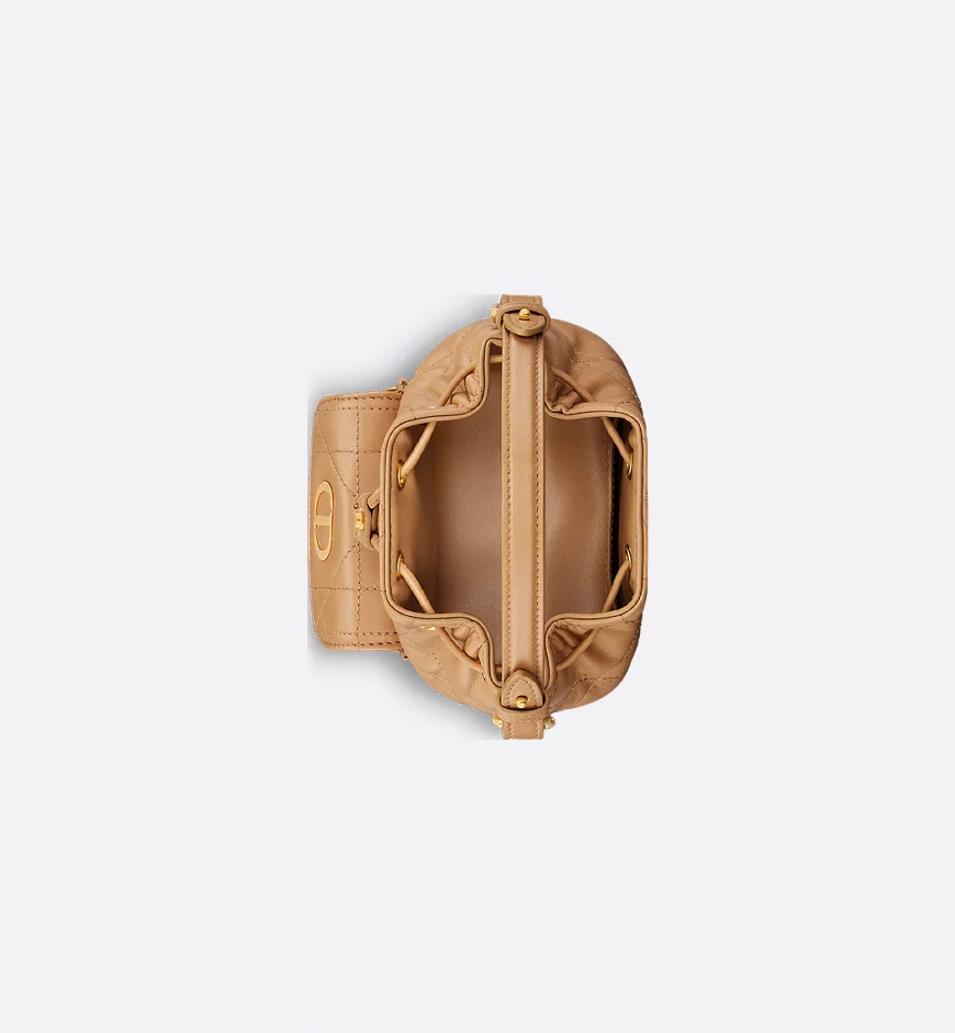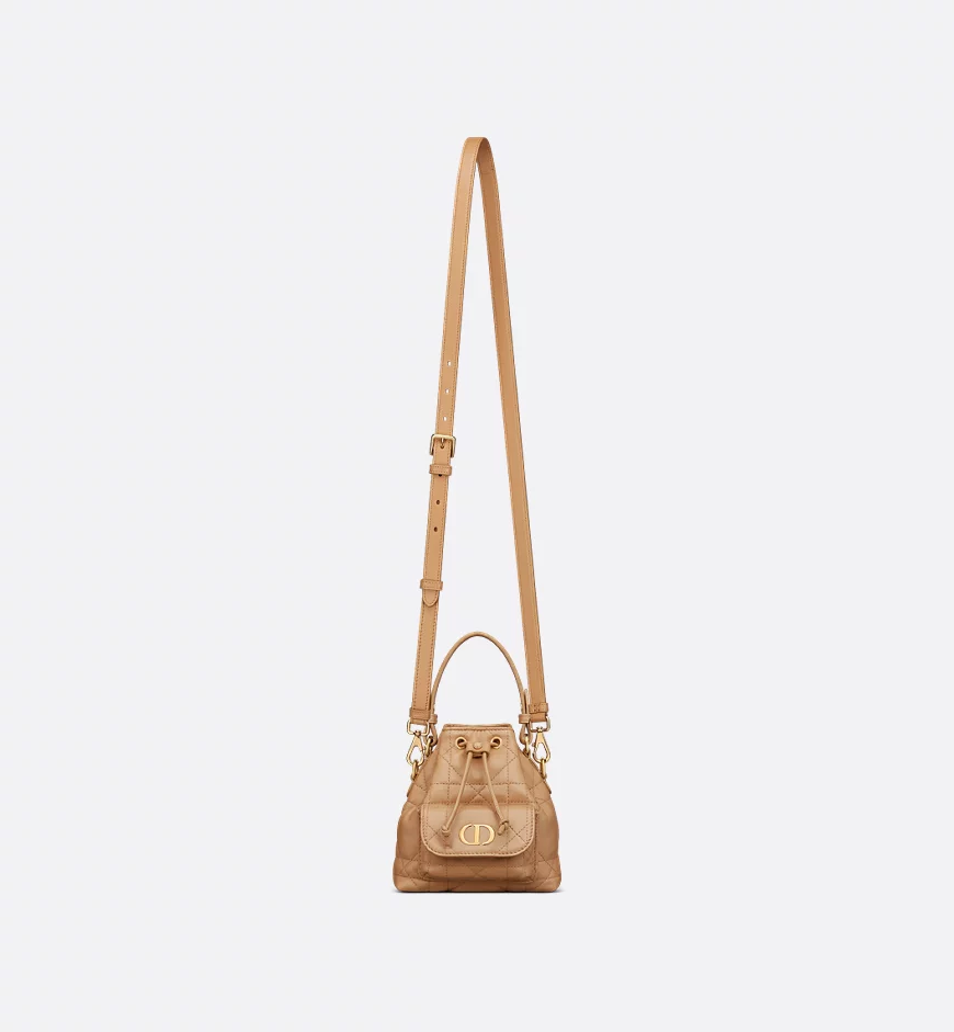This new Dior Caro mini bucket bag, a addition to the Fall 2025 collection, embodies chic elegance. Crafted from light gold-toned lambskin with large cannage stitching elevates the design, and it features a drawstring compartment. A front flap pocket adorned with a vintage gold-finished CD logo can hold all your small essentials. This versatile bag features a detachable top handle and an adjustable and detachable shoulder strap for easy carrying by hand, over the shoulder, or crossbody.