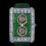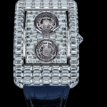 Billionaire is born from the profound love Jacob Arabo has for diamonds. Of all gems, it holds a special place in his creative heart and mind. Since his earliest days as a jeweler, he has developed a passion for perfection, for the most lavish, large, white and pure of diamonds. Since the early days of Jacob & Co., Jacob Arabo has dreamt about a culminating creation where diamonds and watchmaking would both peak together. In 2016, that intimate calling came to fruition with the release of a skeleton, tourbillon, one-of-one timepiece entirely set with very large diamonds : Billionaire. With a price tag, number of diamonds and design that had never been seen before, the first Billionaire shattered all records, and was followed by several variations. Billionaire Double Tourbillon is a first in the Billionaire collection on many counts. It is the first one with a full dial, entirely set with 168 emerald-cut diamonds, laid out in a “brick wall” pattern. It is the first to come on a blue alligator leather strap with its own, separate diamond-set clasp. And it is the first in the series to feature a double flying tourbillon movement.