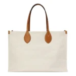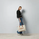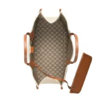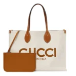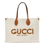 The House’s signature prints are constantly reimagined, vividly showcasing the House’s distinctive aesthetic. A key narrative element of the Cruise 2024 collection, the “Gucci Made in Italy” print adorns this beige canvas tote, complementing the light brown piping and GG Supreme canvas lining.