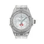 The Hublot Big Bang 39 mm (ref. 465-SX-2020-VR-1204-LIP20) features an automatic movement; multi-colored picture with arabic numerals and index markings; sapphire-crystal, transparent case back; and 39 mm, stainless steel case on a rubber strap with a steel folding clasp.