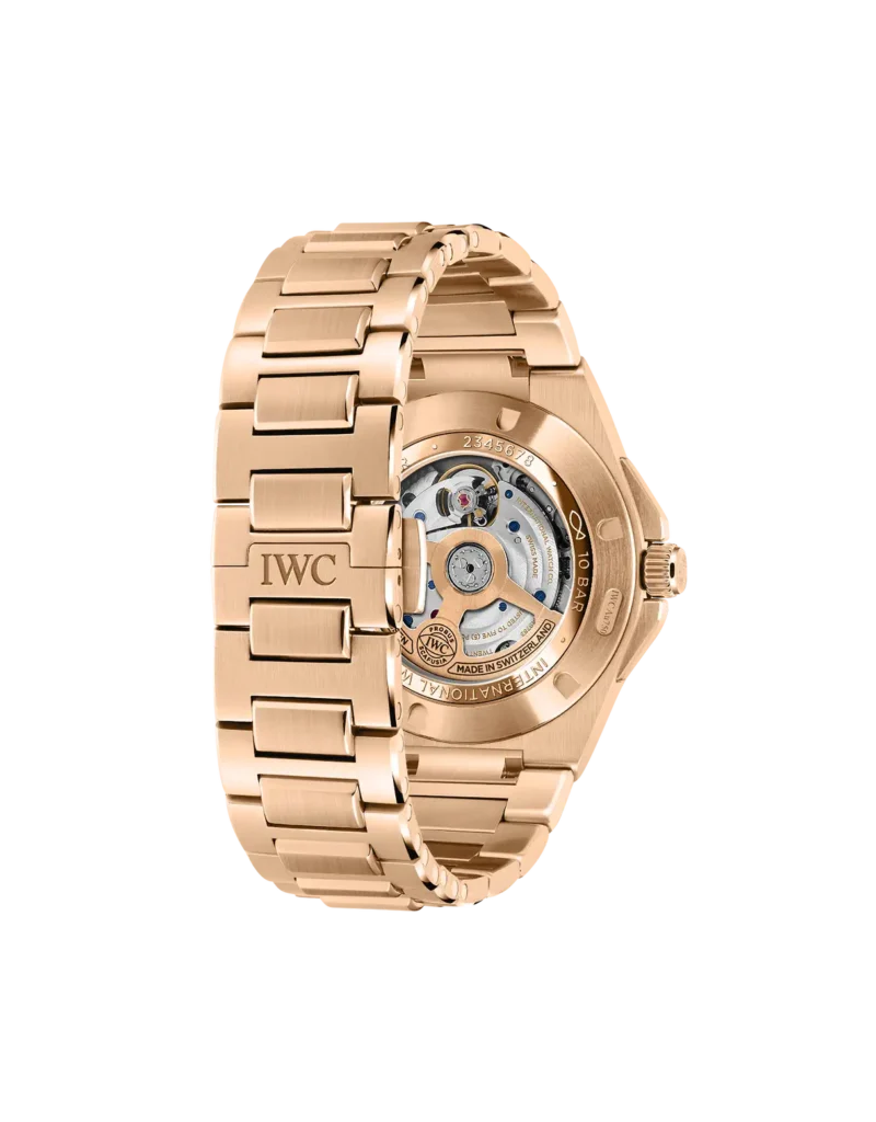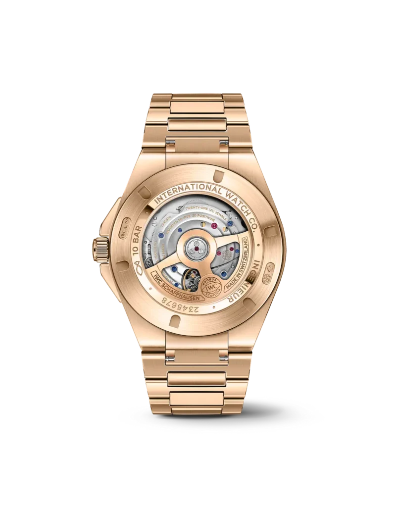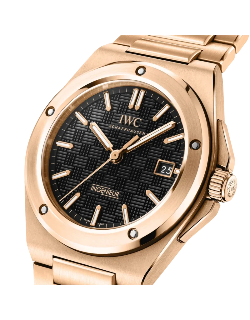 The Ingenieur Automatic 40 features an 18K 5N gold case and an integrated 18K 5N gold bracelet. It features a black dial, 18K gold hour markers, and gold-plated hands.