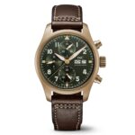 Highlights: The IWC-manufactured 69380 caliber is a rugged chronograph movement with a classic column wheel design. It displays stopped hours and minutes in two subdials at ‘9 o’clock’ and ’12 o’clock’. This chronograph with a bronze case, an olive green dial and a brown calfskin strap has a unique character. Depending on the use to which it is put, bronze develops a patina in the course of time and darkens in color, giving the Pilot’s Watch Chronograph Spitfire (IW387902) its own unmistakable character.