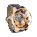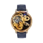 The Jacob & Co. Astronomia ref: AT102.40.DR.UC.A features a 47mm case crafted from rose gold. This timepiece operates on a manual winding movement, specifically the JCAM23. The dial is presented in black, offering a striking contrast to the rose gold elements. The watch is designed to showcase intricate mechanics and celestial themes, making it a notable piece in any collection.