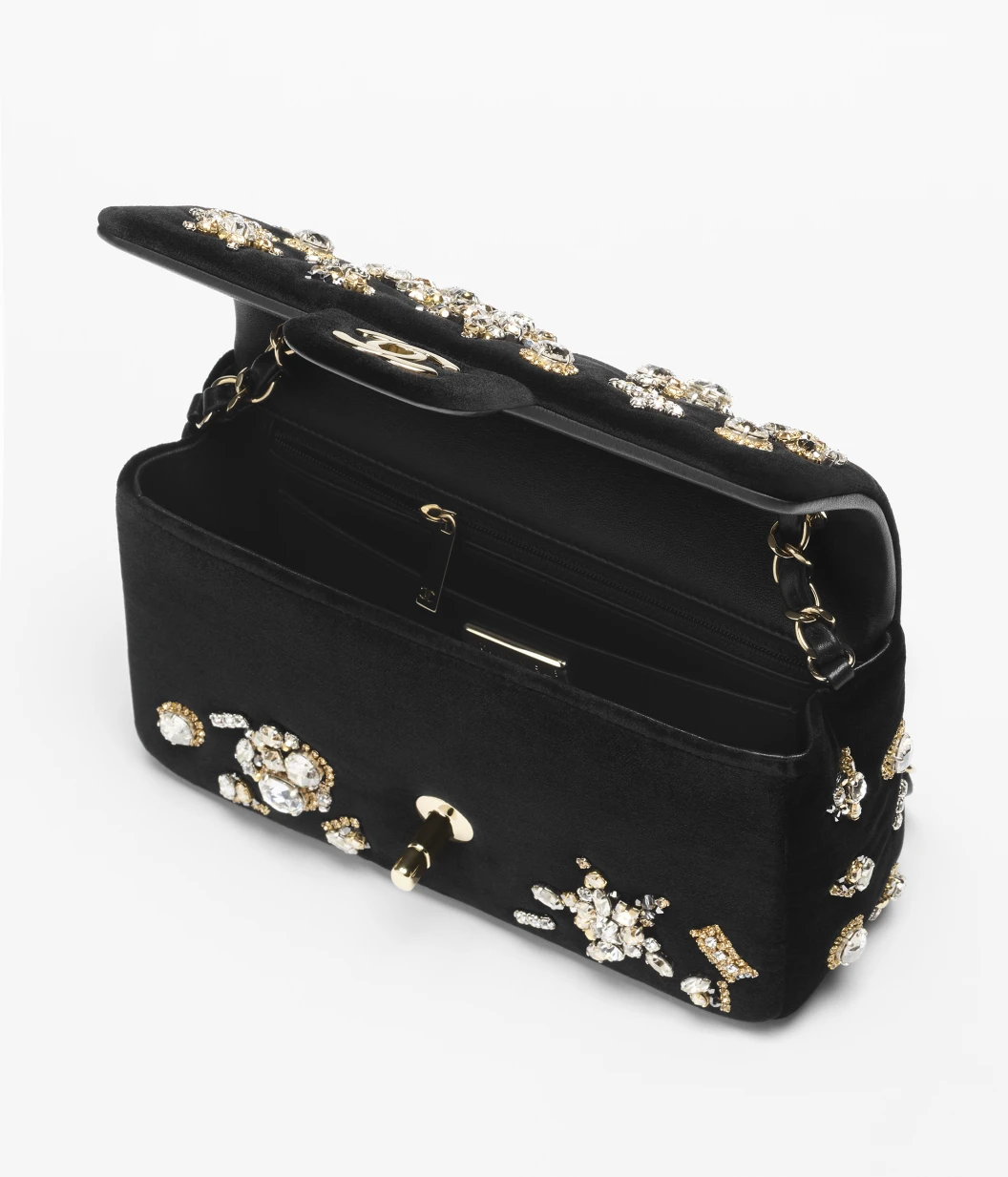 Be the first to review “Mini Classic Bag Velvet, rhinestones, illusion pearls & gold-tone metal black” Cancel reply