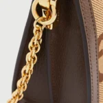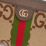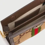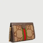 The Ophidia Jumbo GG canvas small shoulder bag blends modern and traditional design, featuring camel and ebony large GG canvas, brown leather trim, and gold hardware. Green and red web accents are featured, while the cotton and linen-lined interior features a hand-painted Double G border, two compartments, an interior open pocket