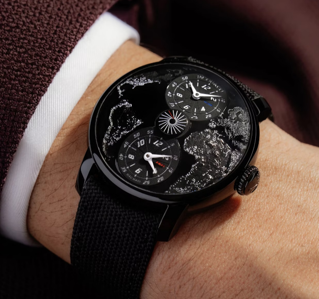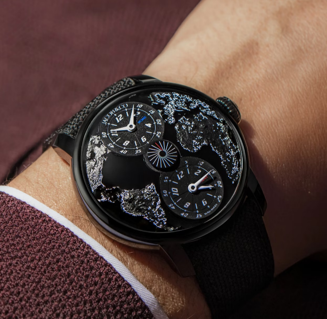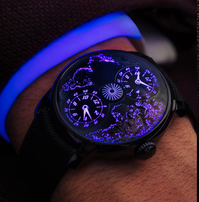 The World Is Yours is the occasion for Jacob & Co. to welcome partners from around the world. Just like Jacob Arabo’s father gave him a key to the world when he gifted him the watch that inspired the collection, Jacob Arabo now opens The World Is Yours to MAD Paris. Working between Paris and London, they made a name for themselves by customizing timepieces for end clients. MAD Paris has a unique take on black watches and on twisting the codes of the material they work with. The World Is Yours Dual Time Zone MAD Paris is lit, from within. It represents the night time aspect of the collection, which complements the day-time dials.