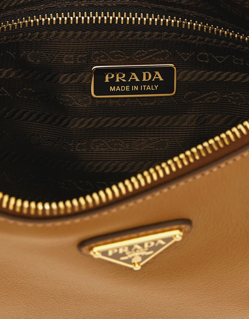 • Soft calfskin shoulder bag with enameled metal triangle logo on the front