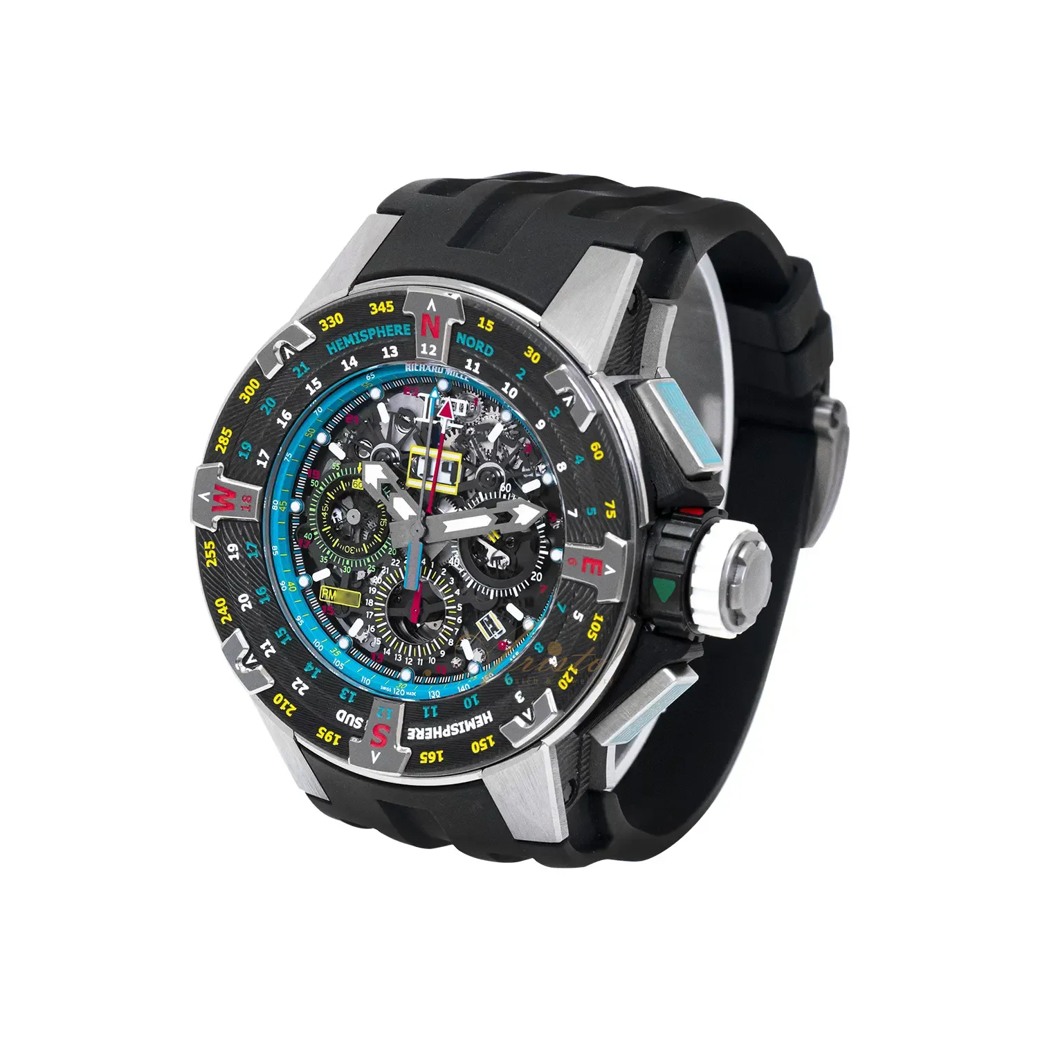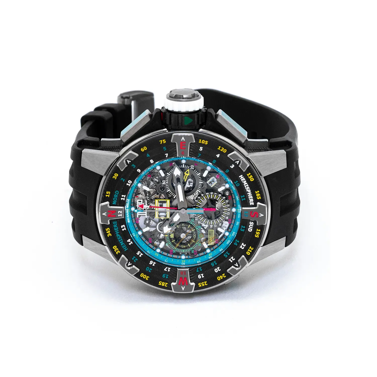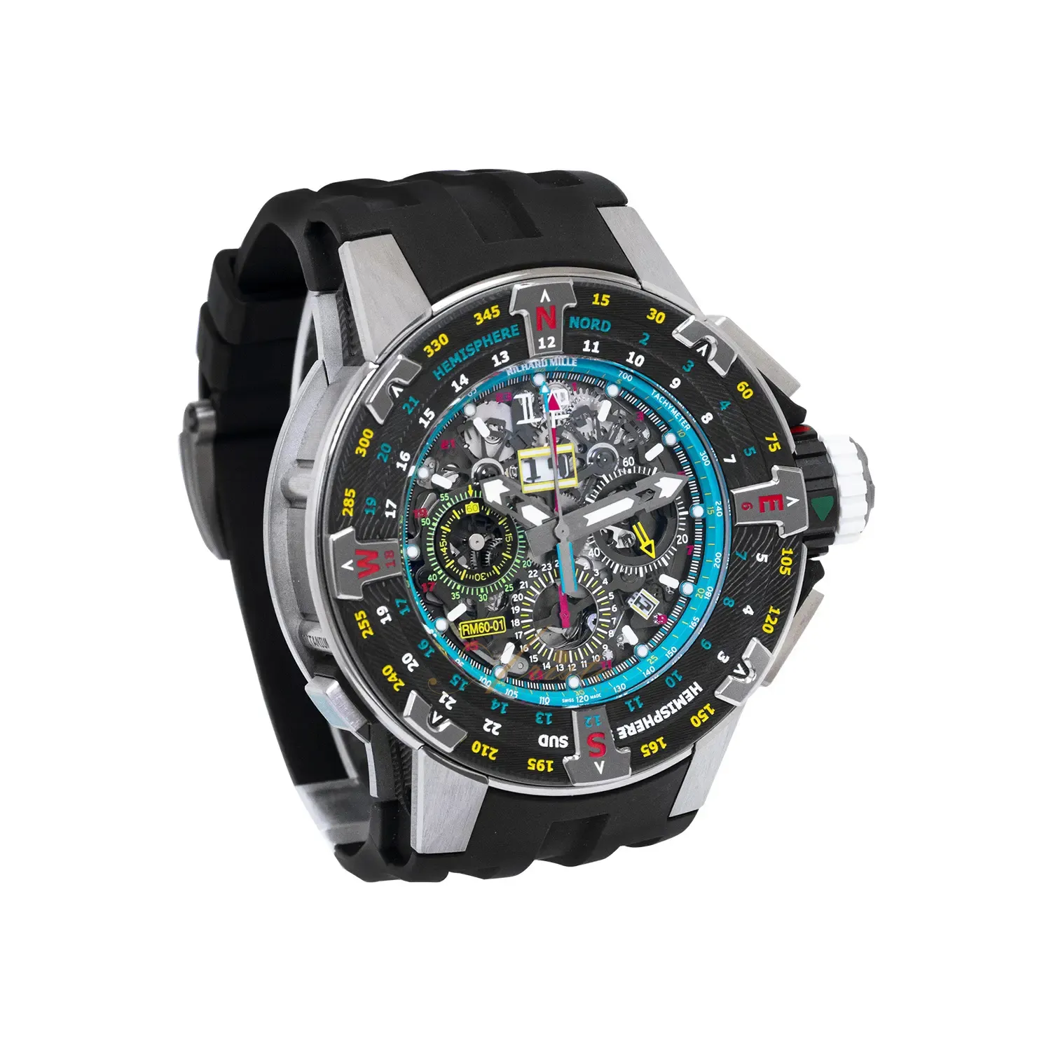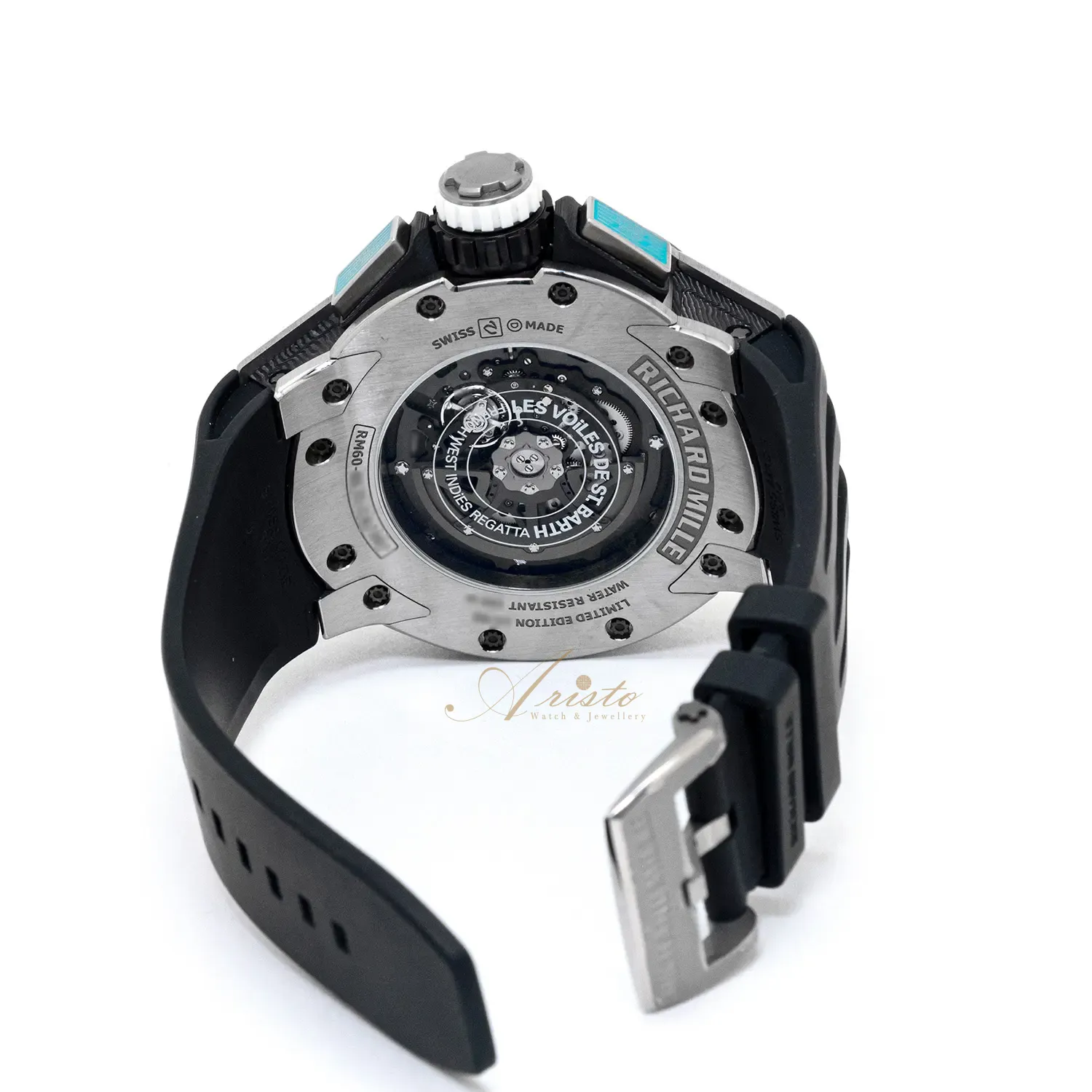 The Richard Mille RM60-01 ref: RM60-01 St Barth Carbon TPT features a Carbon TPT case with a transparent design. This automatic winding timepiece is powered by the RMAC2 movement and was released in 2021. It includes a perpetual calendar, world time function, chronograph, and flyback capabilities. Limited to 80 pieces, this watch also displays the month and calendar functions, making it a complex and functional addition to any collection.
