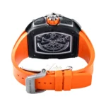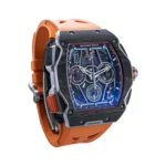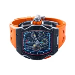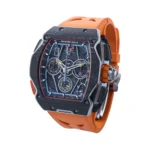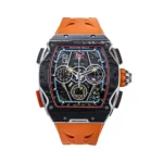 The Richard Mille RM65-01 ref: RM65-01 McLaren features a 44mm case crafted from Carbon TPT, offering a transparent view of its intricate mechanics. This timepiece is powered by the RMAC4 movement, which utilizes automatic winding. It includes functions such as a date display, chronograph, and split seconds chronograph. Limited to just 500 pieces, this model exemplifies precision engineering and innovative design.