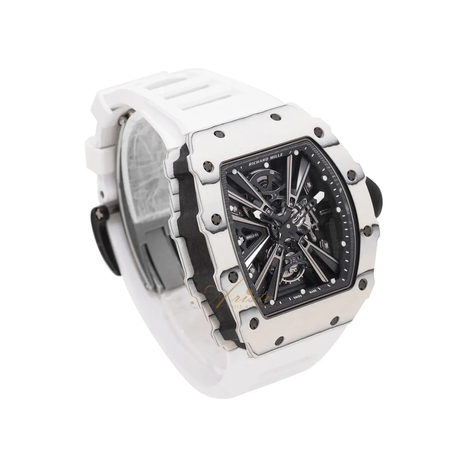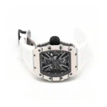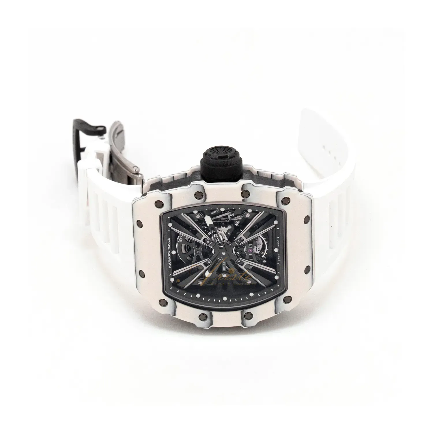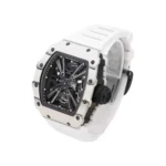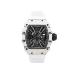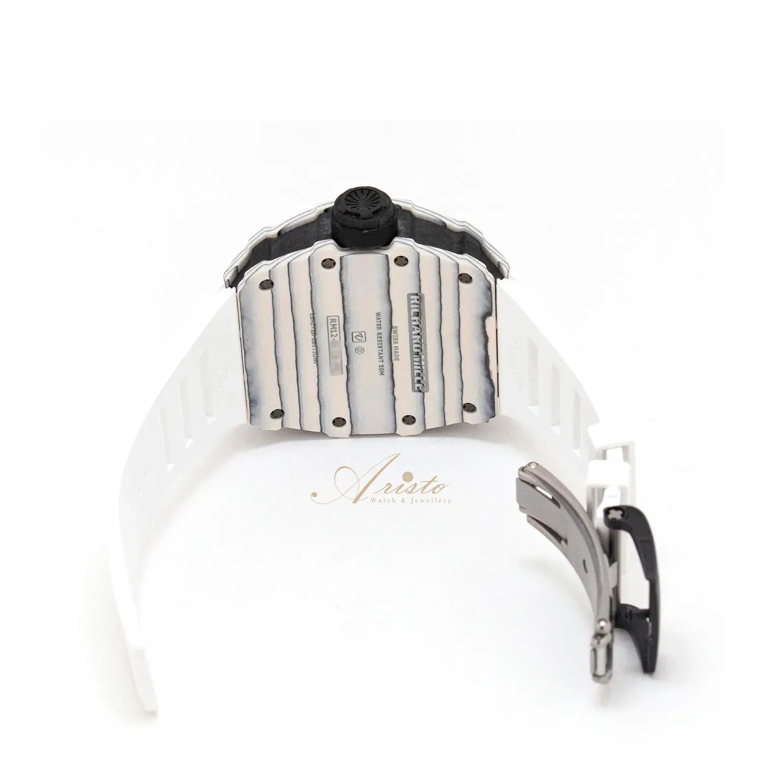 The Richard Mille RM12-01 (reference number RM12-01) measures 43 mm and features a transparent dial made of carbon fiber TPT. This manual-winding movement incorporates a tourbillon function and is limited to 18 pieces. This collection is renowned for its innovative materials and technologies, showcasing the brand’s commitment to high performance and precision craftsmanship.