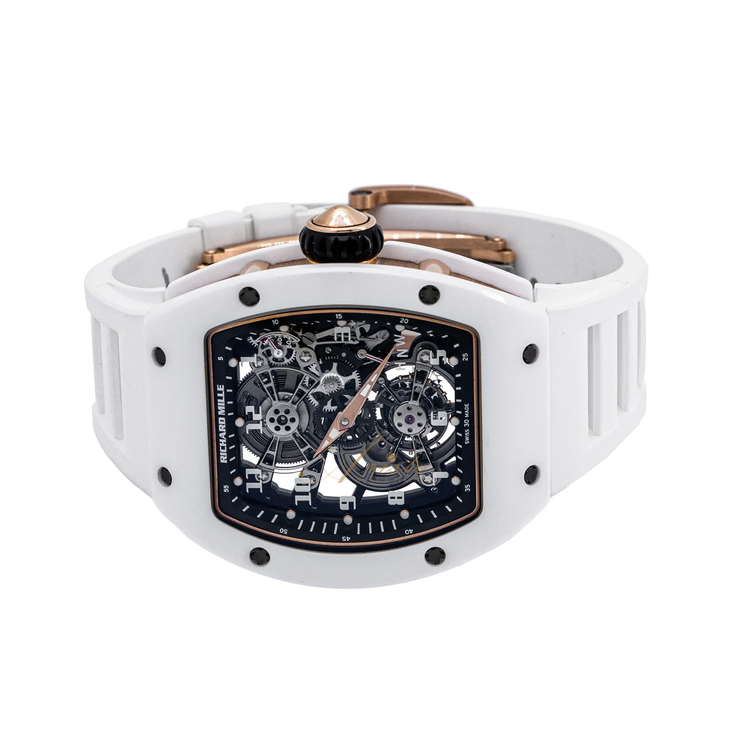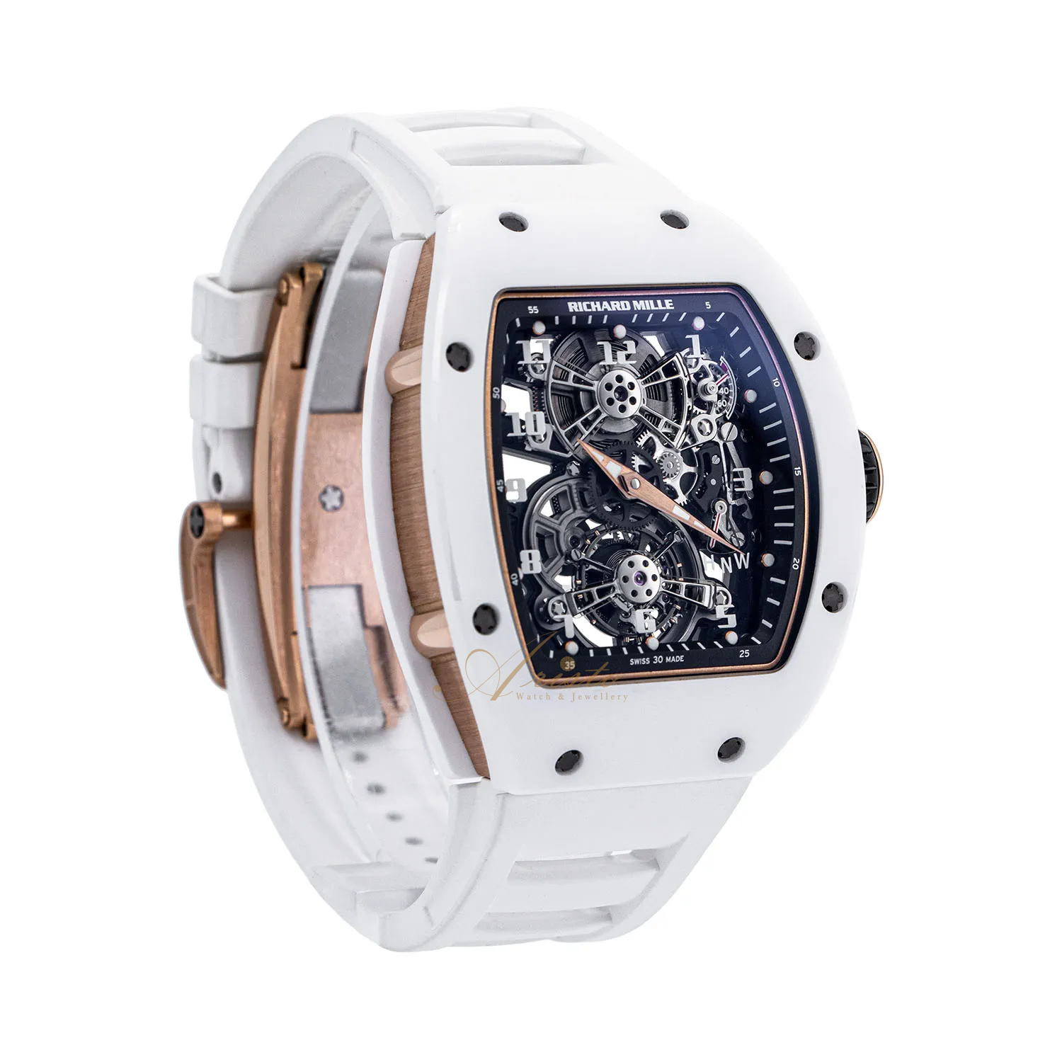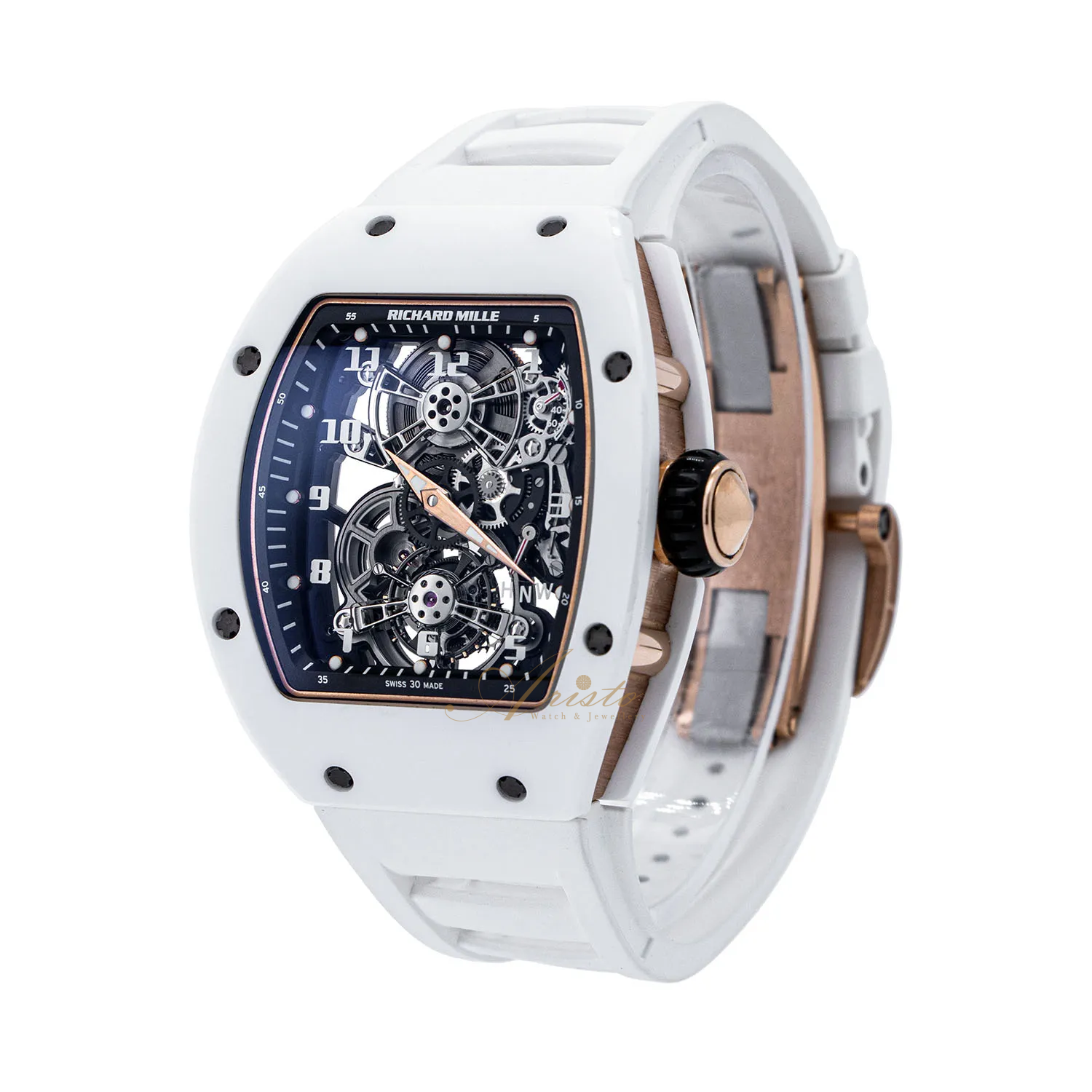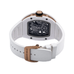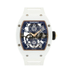 The Richard Mille RM17-01 (reference number RM17-01) is crafted from ceramic and features a power reserve indicator, tourbillon, and skeletonized design. Measuring 39mm, its internal mechanical structure is clearly displayed on the transparent dial. Powered by a manual-winding movement, this timepiece showcases meticulous craftsmanship and design philosophy.