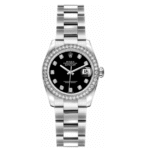 Rolex Lady-Datejust 26 Black Dial Women’s Watch 179384-0002. This 26mm watch features a stainless steel case with a solid 18k white gold diamond-set bezel and is fitted with an Oyster bracelet. The black dial has diamond hour markers and a date window displayed under a cyclops lens at 3 o’clock. It is powered by the Rolex Caliber 2235 self-winding automatic COSC Superlative Chronometer certified movement with a 48 hour power reserve.