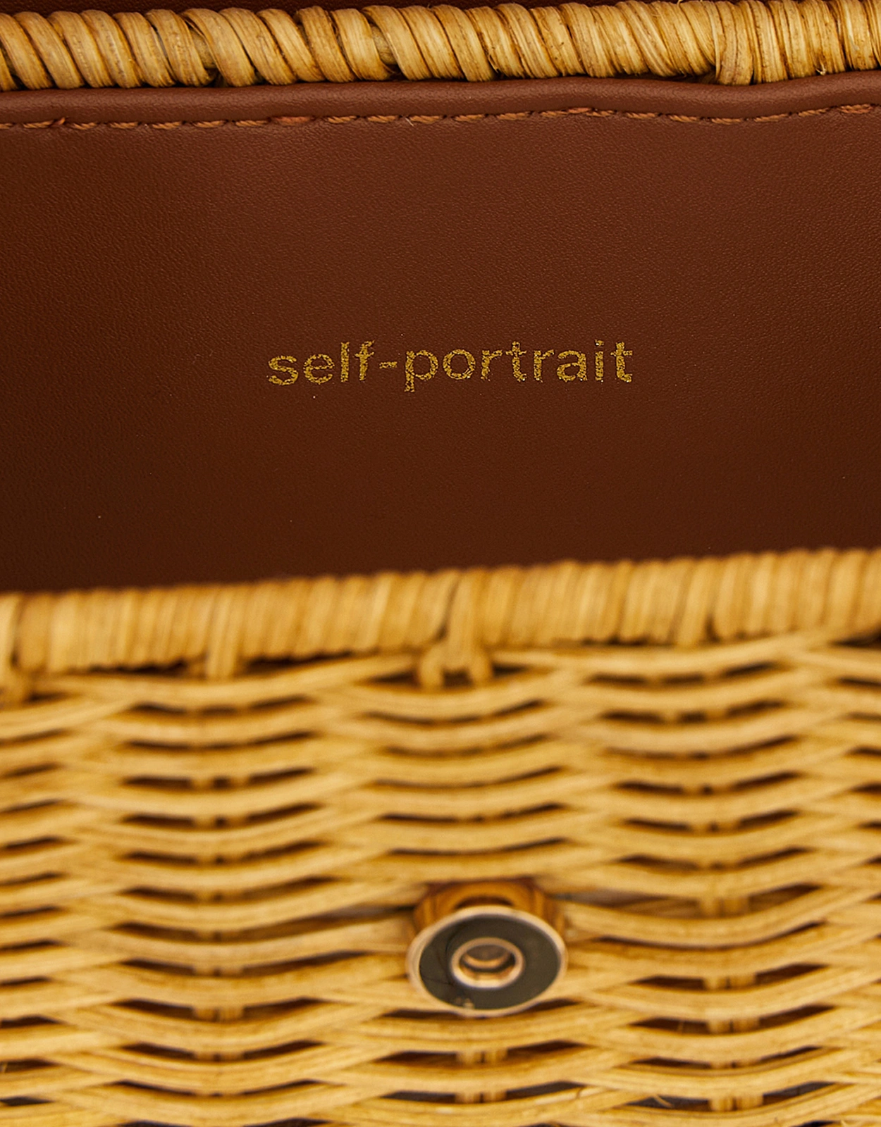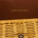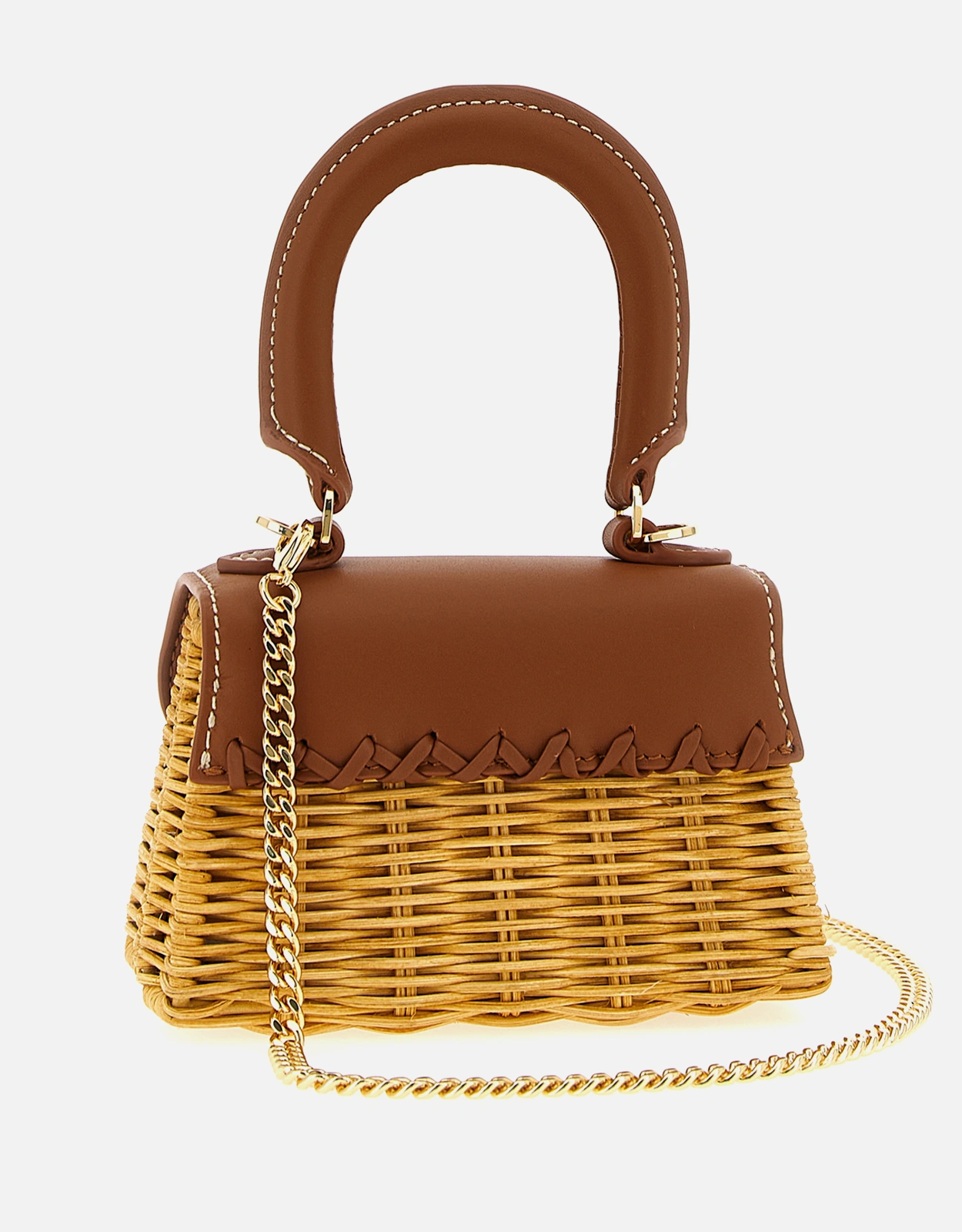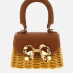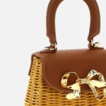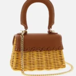 Woven rattan tote with leather details, magnetic clasp with metal logo, and removable chain shoulder strap