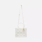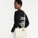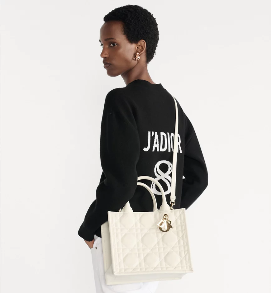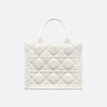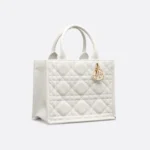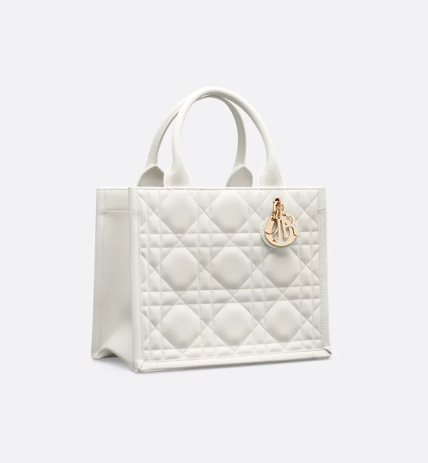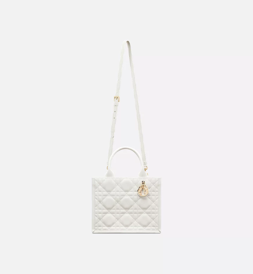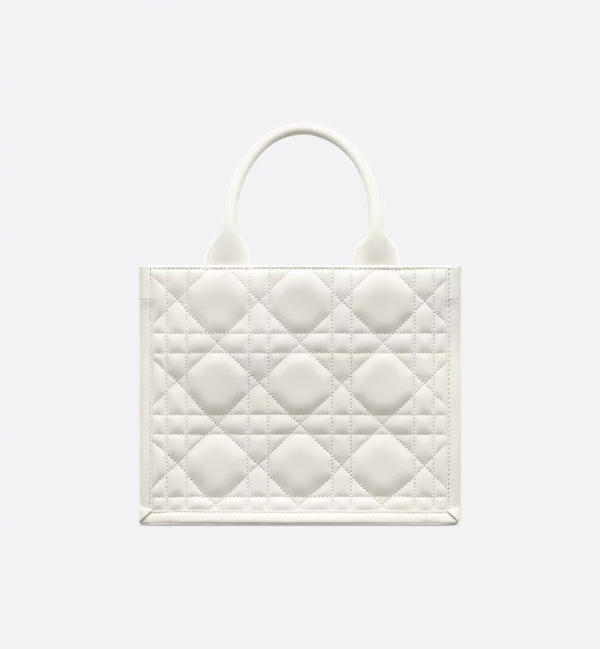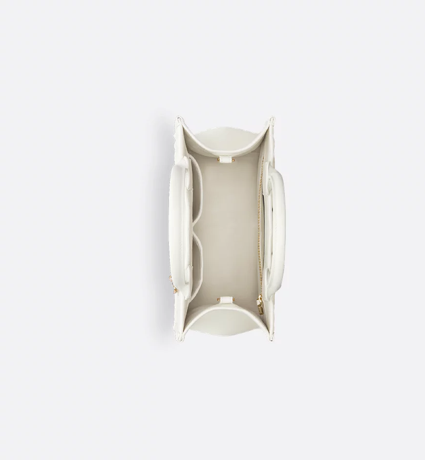 Maria Grazia Chiuri offers an elegant interpretation of the classic Dior Book Tote. Crafted from cream-colored calfskin, it features a large cannage pattern and a pale gold-finished DIOR charm on the front. The cashmere leather interior includes a zip pocket and slip pockets, ideal for organizing everyday essentials. This small, practical tote bag, with its adjustable length and detachable shoulder strap, is a testament to Dior’s exquisite craftsmanship and can be carried by hand or over the shoulder.