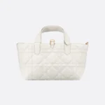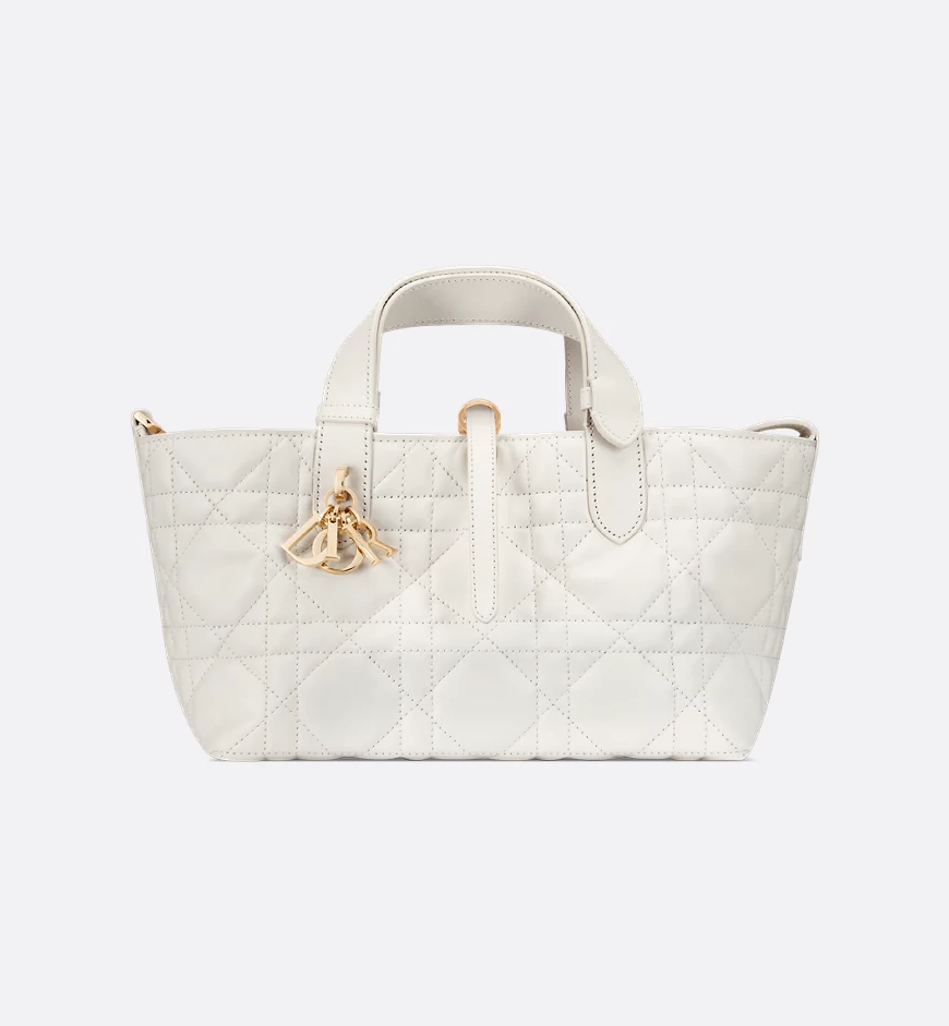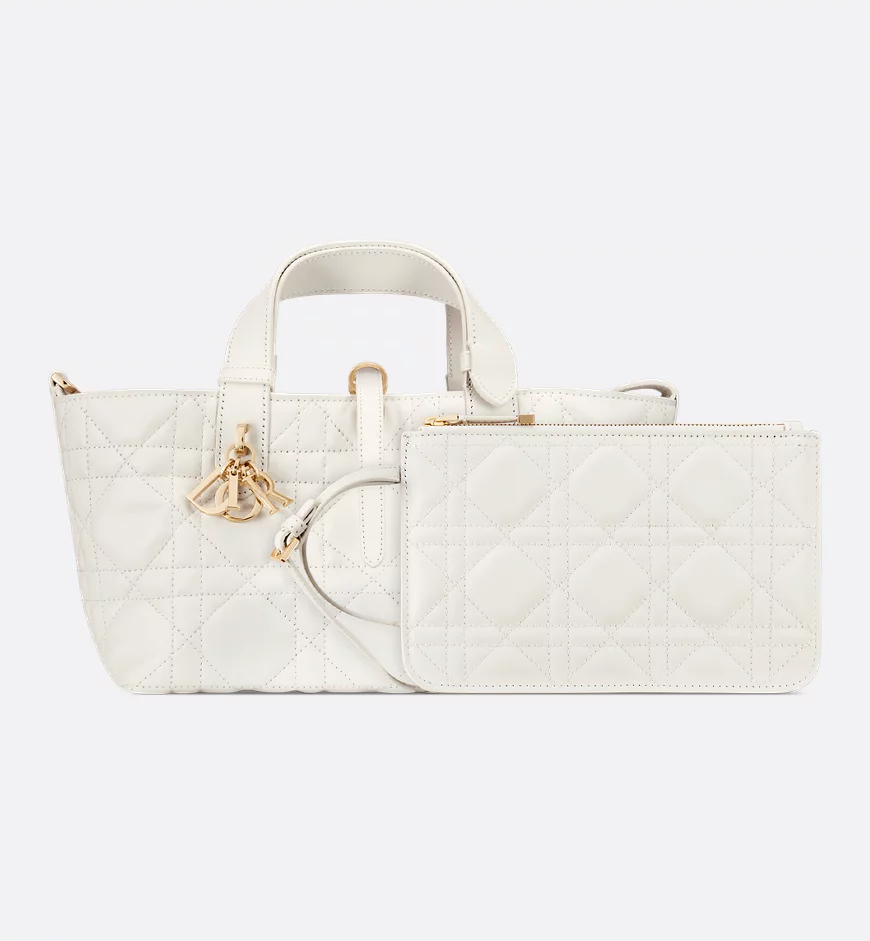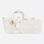 The Dior Toujours handbag features a casual yet practical design. Crafted from cream-colored calfskin with large cannage stitching, it boasts a spacious interior compartment and a matching small pouch for essentials. A slim leather strap closure securely holds items, while the D-shaped CD Lock clasp adds an adjustable touch to the bag’s shape. This smaller size handbag features a leather top handle that can be adjusted with a small cutout for easy carrying.