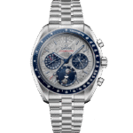 The polished-brushed stainless steel case is set with a polished blue ceramic bezel ring with a white enamel tachymeter scale. The moon phase watch is set on a polished-brushed stainless steel bracelet with OMEGA’s patented comfort adjustment system.