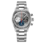 Silver-tone stainless steel case with a silver-tone stainless steel bracelet. Fixed silver-tone stainless steel bezel. Grey dial with silver-tone hands and index hour markers. Tachymeter scale around the outer rim. Dial Type: Analog. Luminescent hands and markers. Date display between 4 and 5 o’clock position. Chronograph – sub-dials displaying: three: 12- hour, 30- minute and 60- second. Zenith Calibre El Primero 400B automatic movement with a 50-hour power reserve.