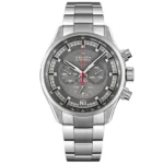 Stainless steel case with a stainless steel bracelet. Fixed bezel. Grey dial with silver-toned hands and index hour markers. Tachymeter scale appears around the outer rim. Dial Type: Analog. Date display at the 6 o’clock position. Automatic movement. Scratch resistant sapphire crystal. Transparent case back. Case diameter: 45 mm.