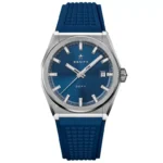 Silver-tone brushed titanium case with a blue rubber (fkm quality) strap. Fixed silver-tone brushed titanium bezel. Blue dial with silver-tone – rhodium plated hands and index – rhodium plated hour markers. Minute markers around the outer rim. Dial Type: Analog. Luminescent hands and markers. Date display at the 3 o’clock position.