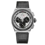 Silver-tone brushed titanium case with a black alligator leather strap. Fixed silver-tone ceramic bezel. Silver-tone dial with silver-tone – rhodium plated hands and index – rhodium plated hour markers. Minute markers around the outer rim. Dial Type: Analog. Luminescent hands and markers. Chronograph – sub-dials displaying: three – 60 second, 30 minute, small second.